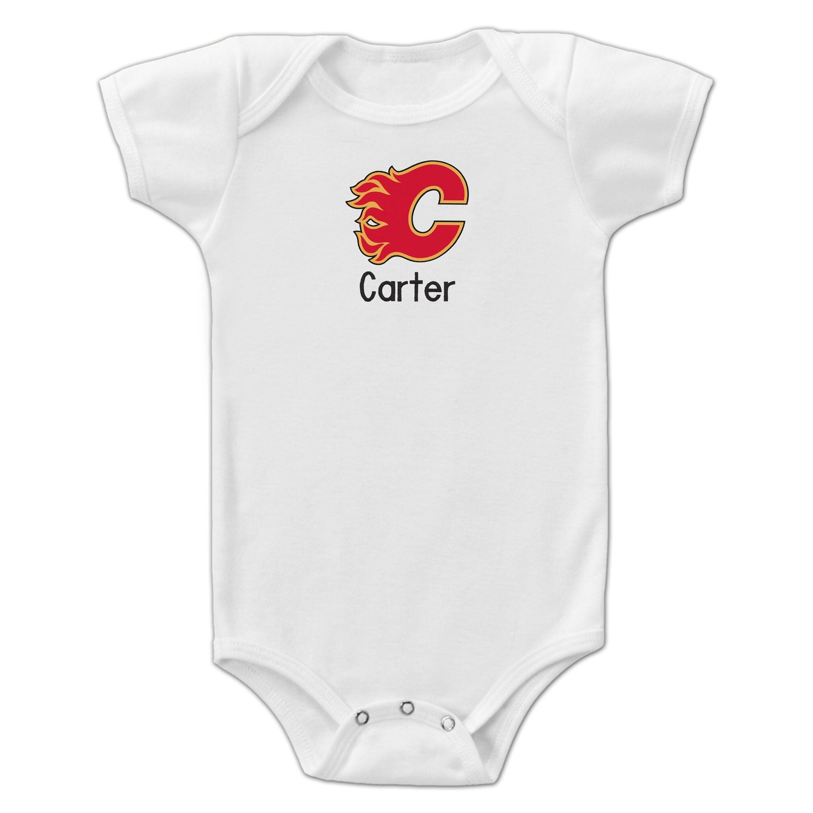 Shop the cutest personalized NHL baby apparel! Get your little one the Calgary Flames Infant Personalized Bodysuit in white at The Shopping Plaza today. #NHL #BabyApparel #CalgaryFlames #Personalized #ShopNow
