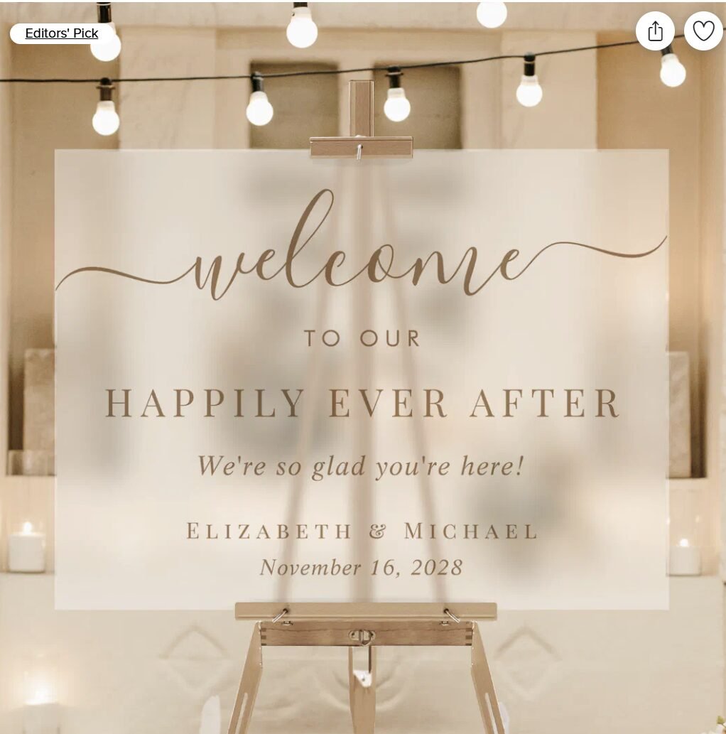 Welcome guests in style with this elegant frosted acrylic wedding sign from The Shopping Plaza. Featuring shimmering gold script and customizable names and date, this modern wedding welcome sign is perfect for ceremony entrances, photo backdrops, or reception décor. A timeless keepsake for your happily ever after.