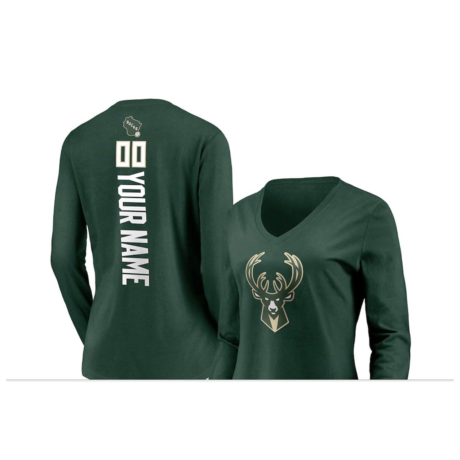 Show off your love for the Milwaukee Bucks in style with our Women’s Playmaker Personalized Name & Number Long Sleeve V-Neck T-Shirt! This Hunter Green tee is perfect for any die-hard fan looking for personalized NBA apparel that stands out from the crowd. Score yours today and represent your favorite team in a unique way!