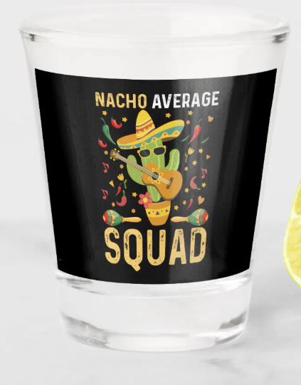 Spice up your Cinco de Mayo festivities with our Nacho Average Squad Mexican Party Shot Glass! Whether you’re sipping on margaritas or taking back shots of mezcal, this funky and fun glassware is the perfect accessory for your fiesta. Viva la fiesta!