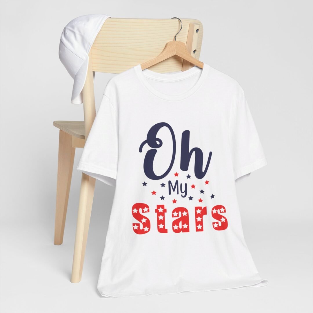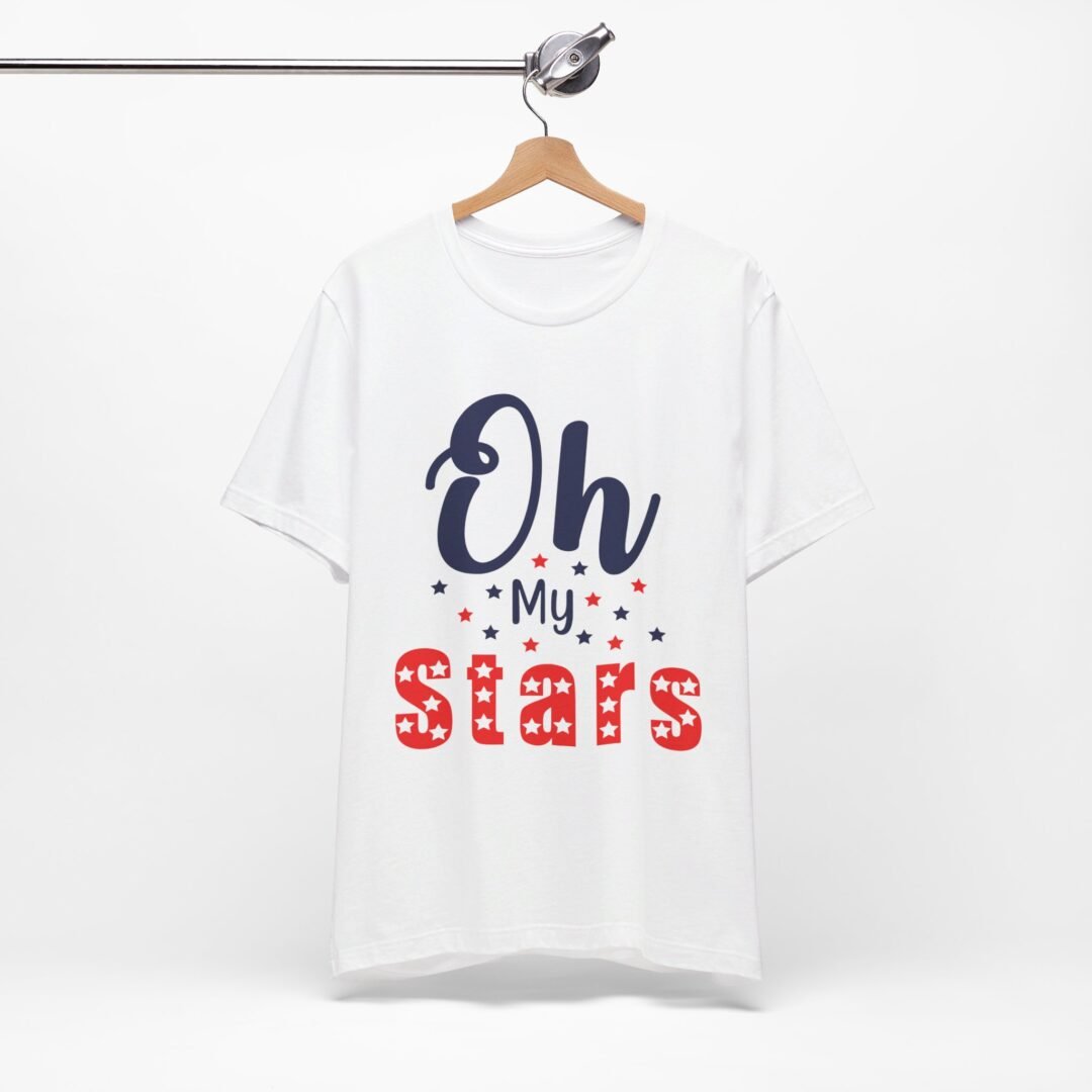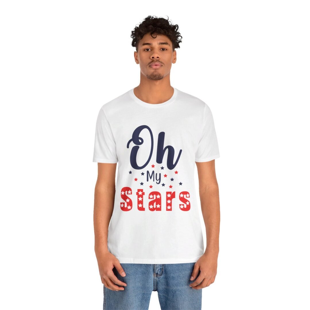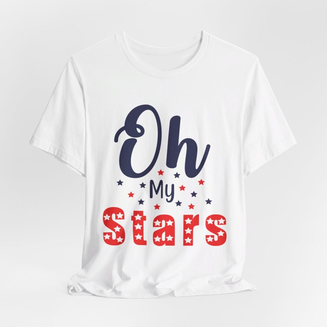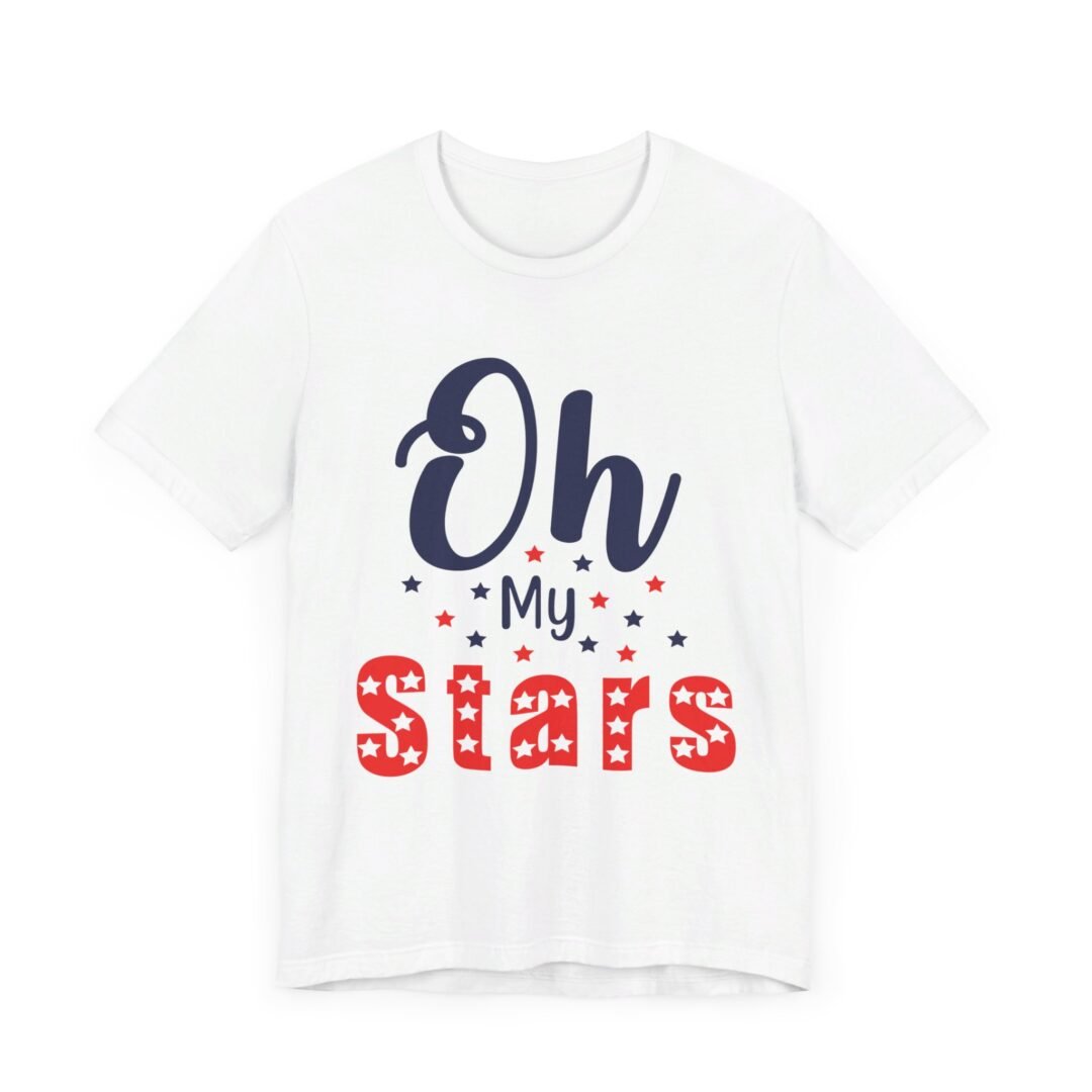 Stand out at your Fourth of July party with our Oh My Stars Tee! This personalized apparel is perfect for anyone who wants to show off their American pride in a fun and fashionable way. Get ready to turn heads and celebrate in style with this patriotic shirt.