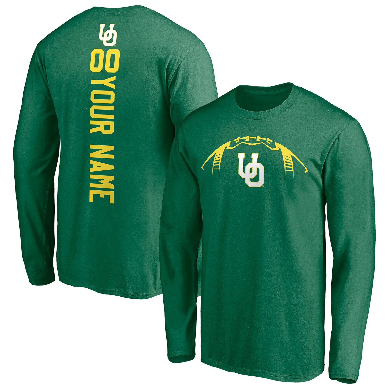 Get your game face on with our Oregon Ducks Playmaker Football Personalized Name & Number Long Sleeve T-Shirt in vibrant green. Show off your team spirit in unique style with this customizable NCAA apparel. Whether you’re on the field or in the stands, this shirt is a winning choice.