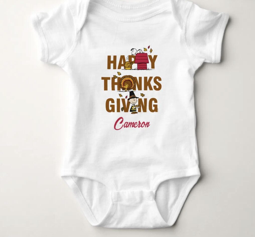 Looking for the perfect outfit for your little turkey this Thanksgiving? Look no further than our Peanuts Happy Thanksgiving Combo Baby Bodysuit! This custom Thanksgiving apparel will have your little one looking cute as a pumpkin pie all day long.