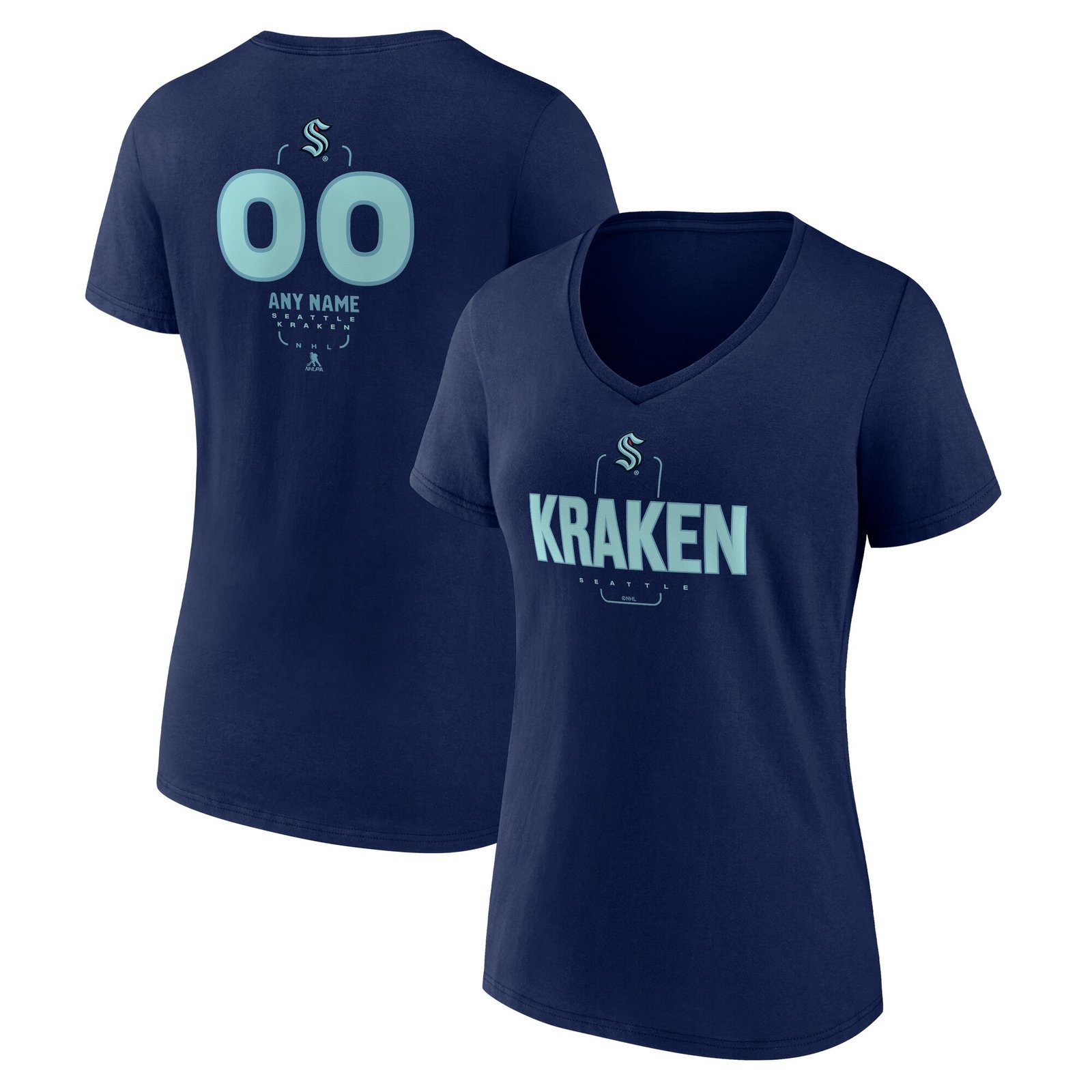 Dive into game day in style with our Seattle Kraken Women’s Personalized Name & Number Midfielder V-Neck T-Shirt in Deep Sea Blue. This lightweight, NHL-approved apparel is perfect for showing off your love for the Kraken in a personalized way. Whether you’re cheering in the stands or watching from home, this shirt is a must-have for any true Seattle hockey fan.