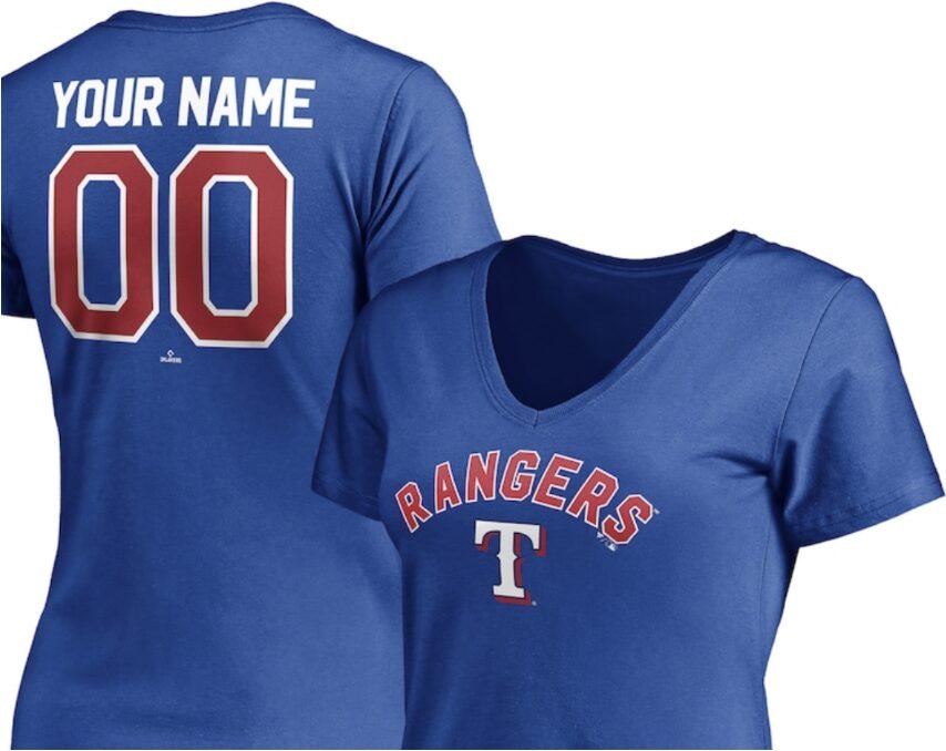 Hit a home run in the fashion game with our Texas Rangers Women’s Personalized Winning Streak Name & Number V-Neck T-Shirt. Made for true fans of personalized MLB apparel, this royal blue tee is the perfect way to show off your team spirit and rep your favorite player in a fun and fashionable way. Get yours today and cheer on the Rangers in style!