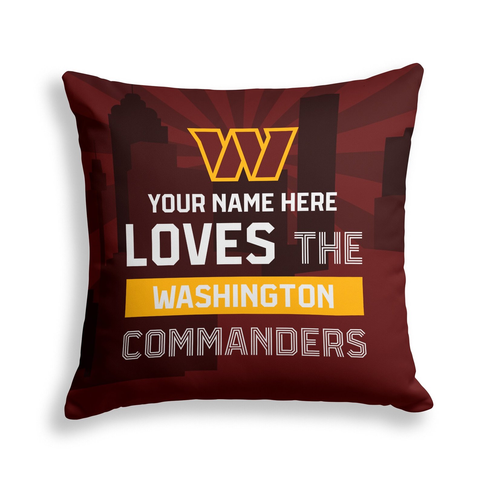 Elevate your space with a personalized NFL home decor pillow from The Shopping Plaza! Get your Washington Commanders Pegasus 18″x18″ City Skyline design today. #homedecor #NFL #WashingtonCommanders #interiordesign #personalizedpillow #homedesign #customdecor #cityskyline #football #shoplocal